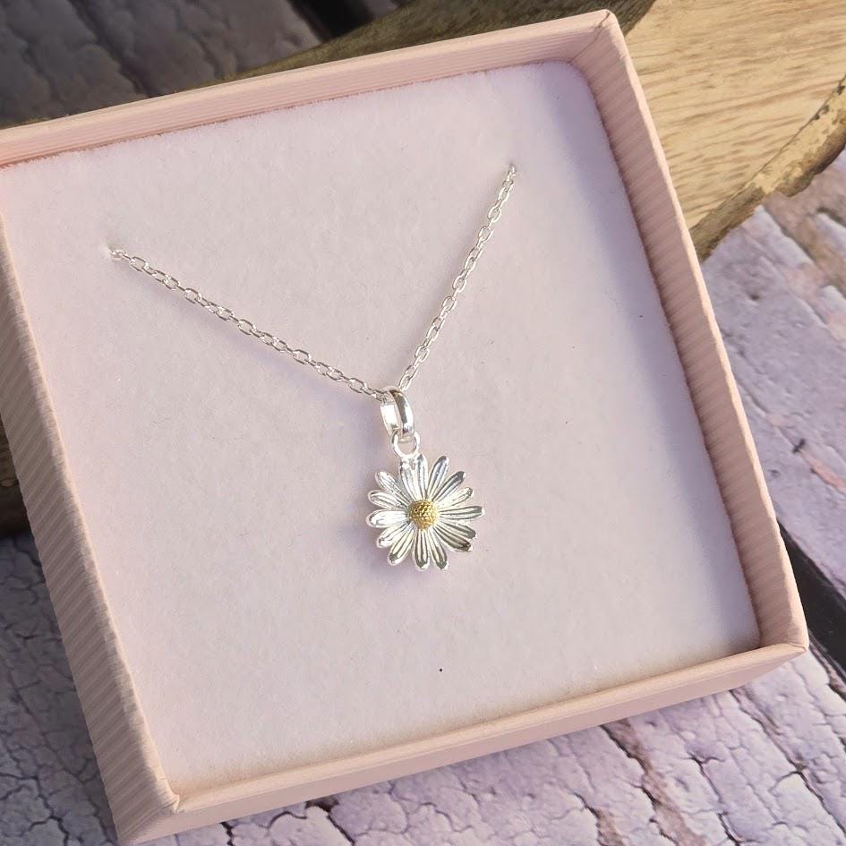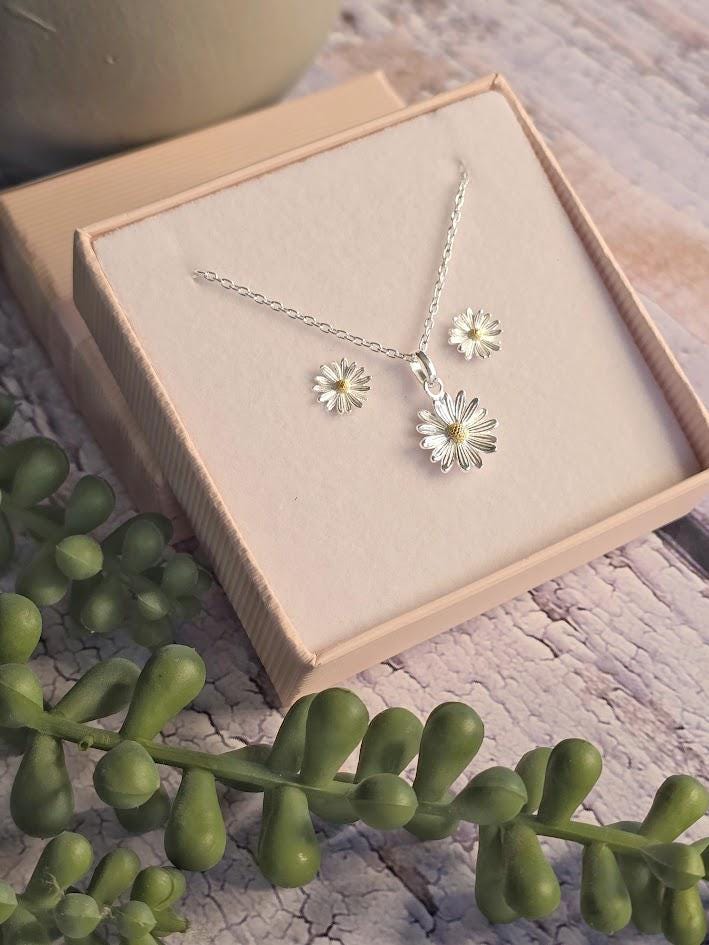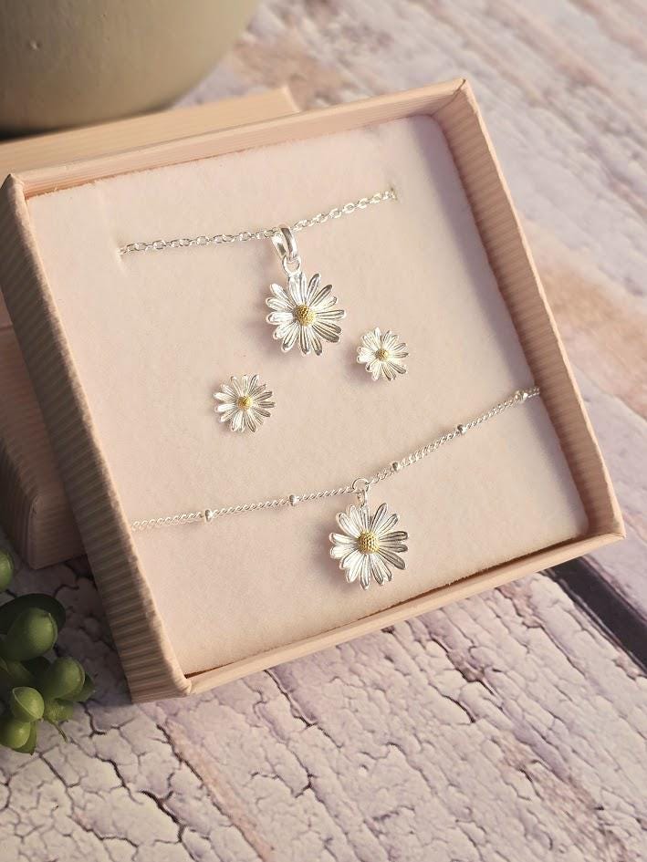 Complete your look with this elegant Silver Daisy Jewellery Set, featuring a matching pendant, earrings, and bracelet. Made from 925 sterling silver with delicate gold detailing at the centre of each daisy, this set celebrates the timeless beauty of the daisy, the birth flower for April. With its cohesive, minimalist design and nature-inspired charm, this set is perfect for any occasion.